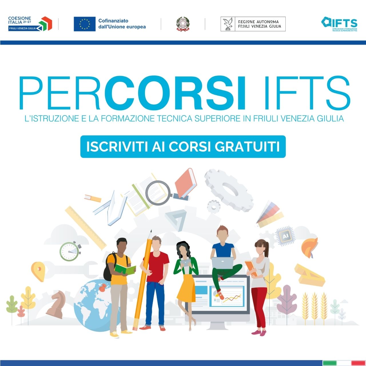 La partecipazione ai corsi è completamente gratuita perchè beneficiano del sostegno cofinanziato dal Fondo sociale europeo Plus della Regione autonoma Friuli Venezia Giulia, nell’ambito dell’attuazione del PR FSE+.