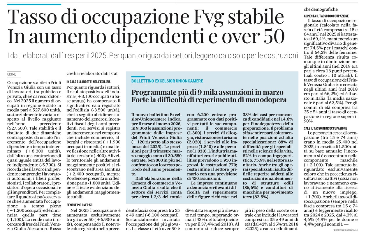 Occupazione stabile in Friuli Venezia Giulia il Pais